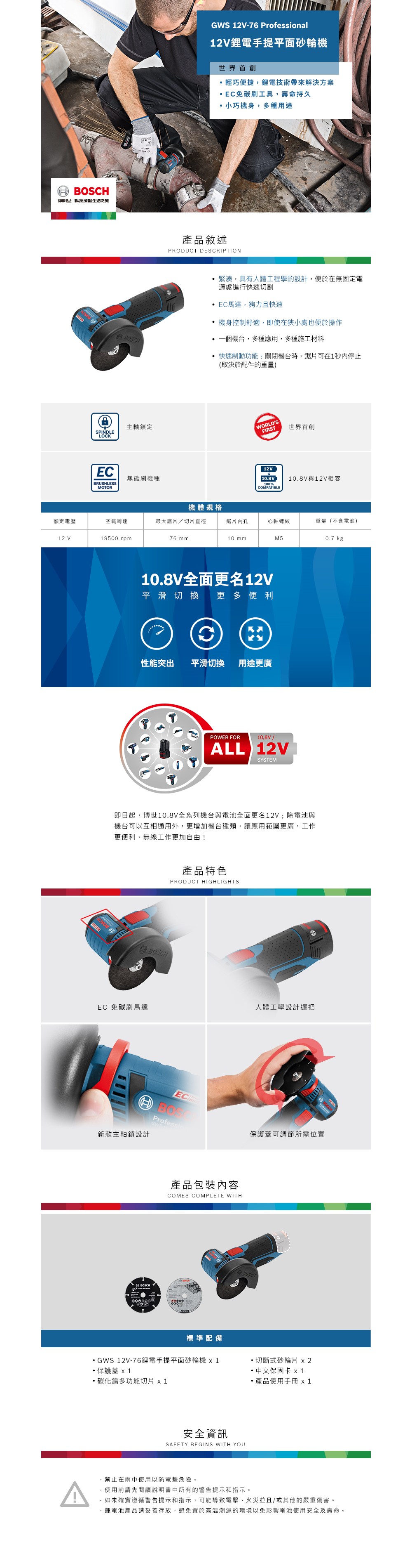 BOSCH 12V 鋰電 3" 免碳刷手提圓切機 GWS 12V-76 (單機)