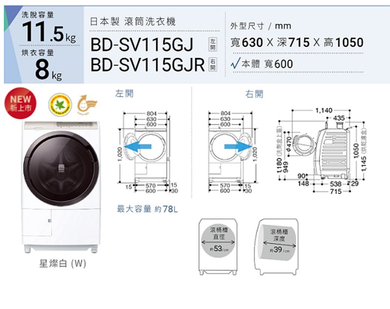加碼雙重送【HITACHI日立】11.5KG日製變頻左開滾筒洗脫烘洗衣機BDSV115GJ-W