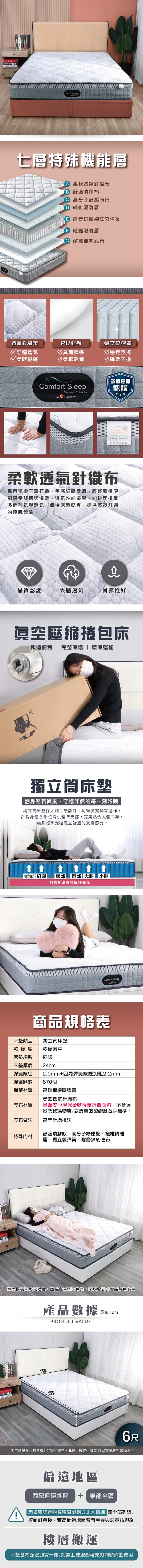 ✔床墊內部精心設計七層特殊機能結構,精選透氣針織表布、高分子舒壓海綿、獨立袋彈簧等,每層皆經過科學配置,兼具支撐、舒適與透氣功能。從表層的親膚布料到核心支撐層,層層呵護,帶來如雲端般的睡眠體驗,讓身心得到全方位的放鬆與支撐。