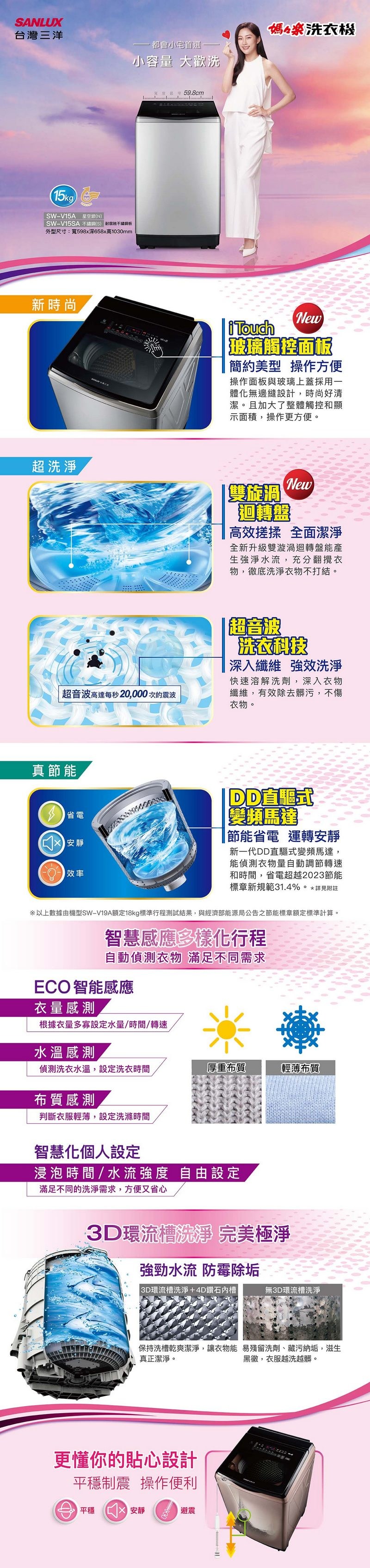 SANLUX台灣三洋15公斤DD直流變頻超音波洗衣機(內外不鏽鋼) SW-V15SA~含基本安裝+舊機回收