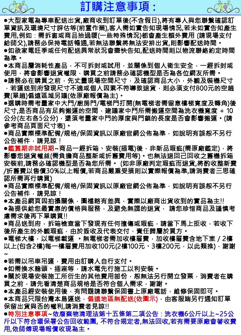 ◎特別注意事項~依廢棄物清理法第十五條第二項公告 : 洗衣機6公斤以上~25公斤以下符合環保署公告回收範圍, 不符合規定者,無法回收,若有需要原廠會著收費用,依師傅現場報價收現為主。
