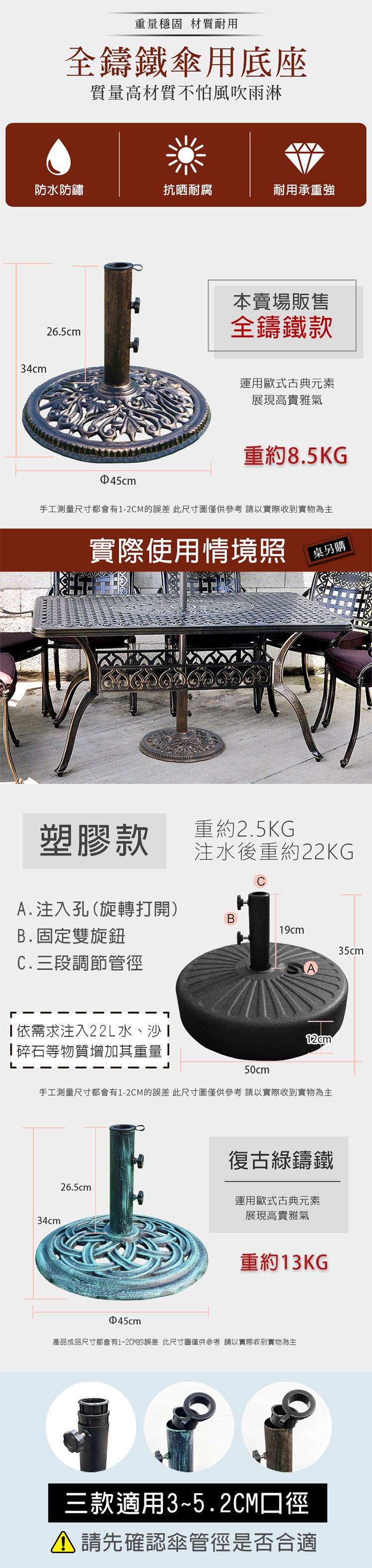 ✔直徑45cm全鑄鐵,適合搭配大型7尺傘使用