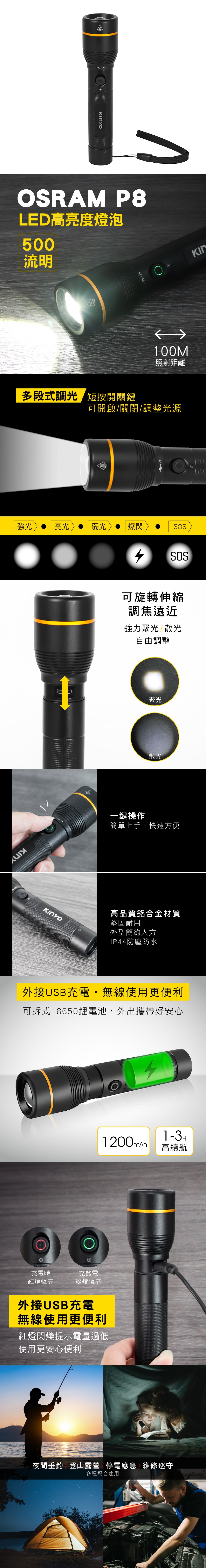KINYO 充電式伸縮變焦手電筒