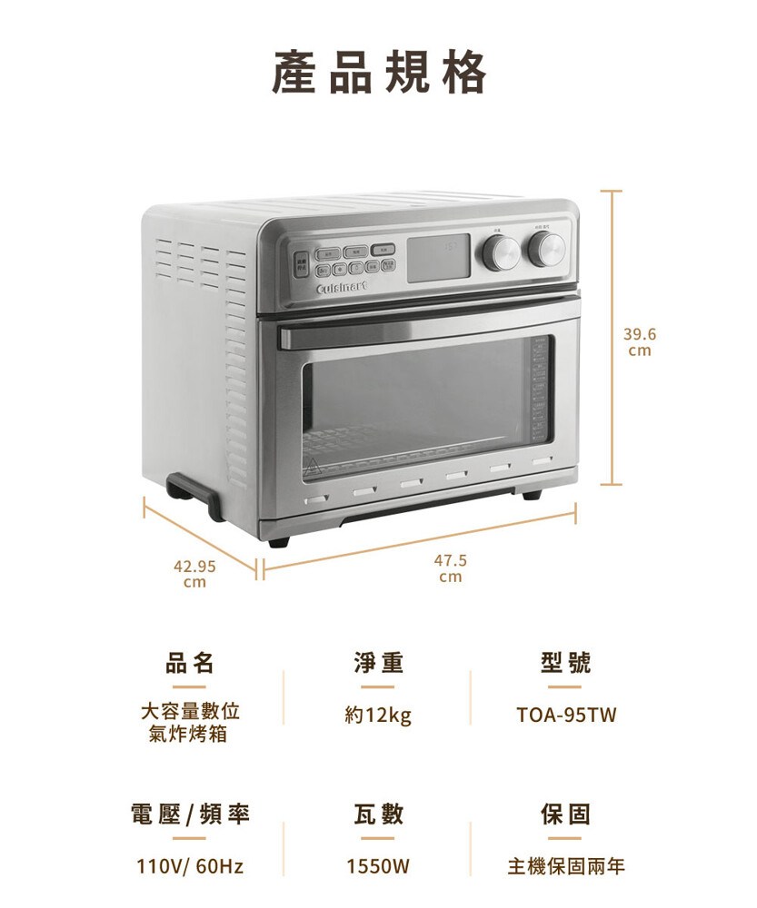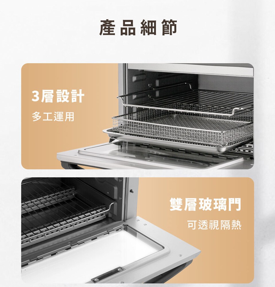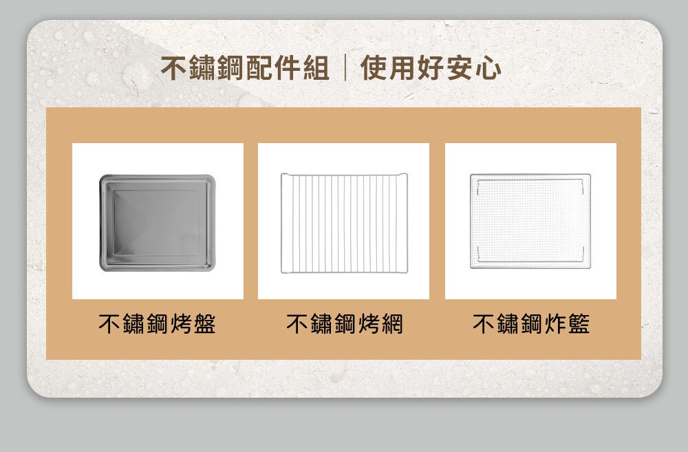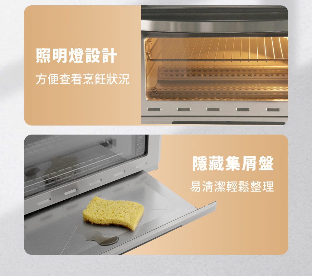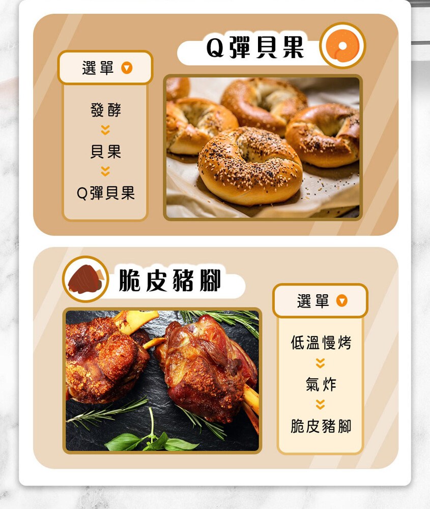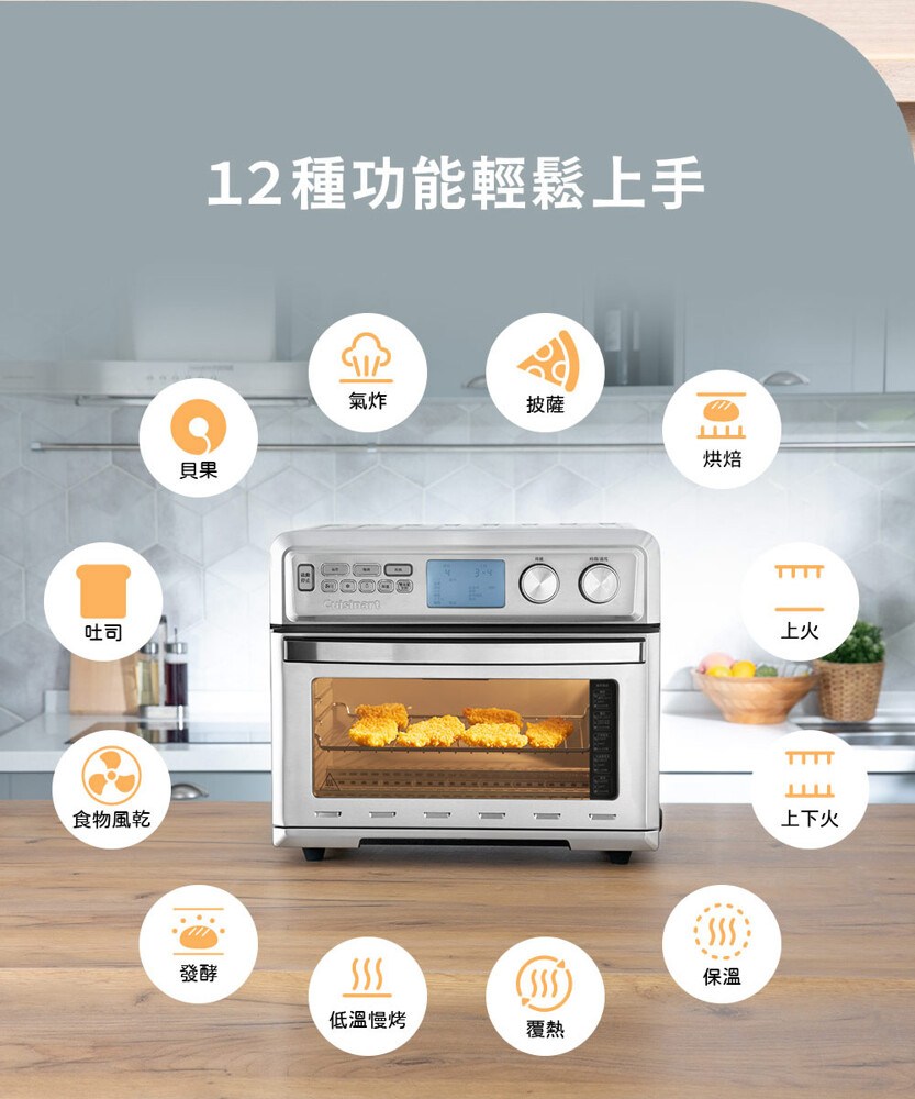◆12種烹調功能:氣炸、貝果、吐司、披薩、烘焙、上火、上下火、低溫慢烤、食物風乾、發酵、保溫、覆熱。
