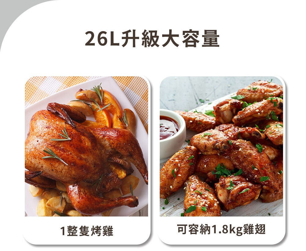 ◆26公升容量大升級,可放入整隻烤雞/9片吐司/13吋披薩/1.8kg雞翅。