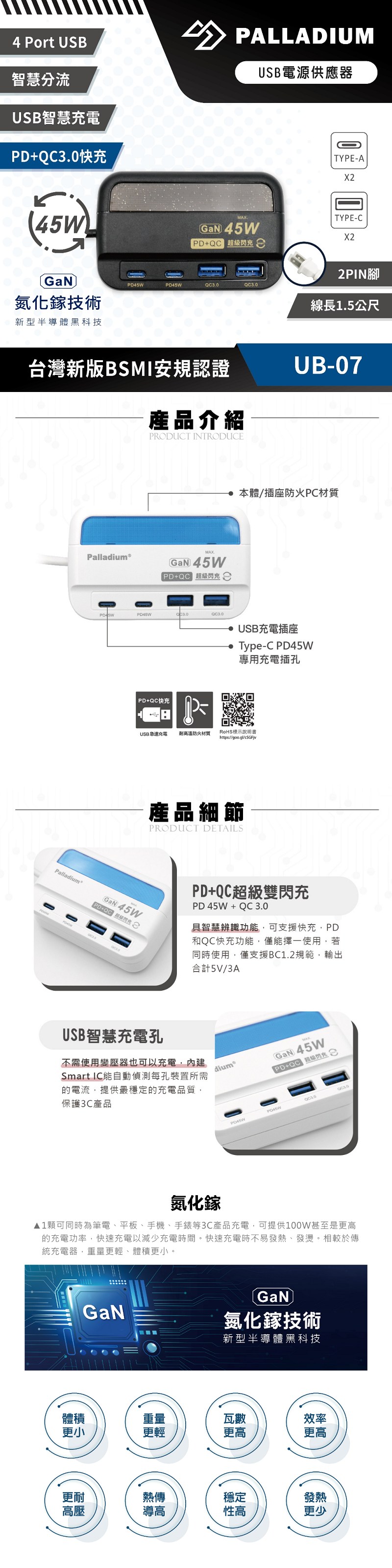 1.內置Smart charger晶片,具智慧辨識功能,單孔最大輸出電流為45W