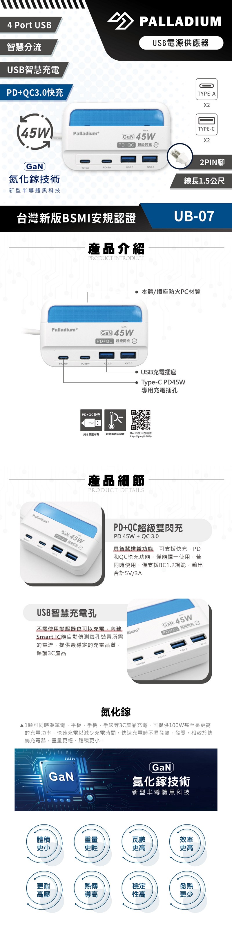 Palladium帕拉丁 PD45W氮化鎵 超級閃充USB電源供應器 UB-07
