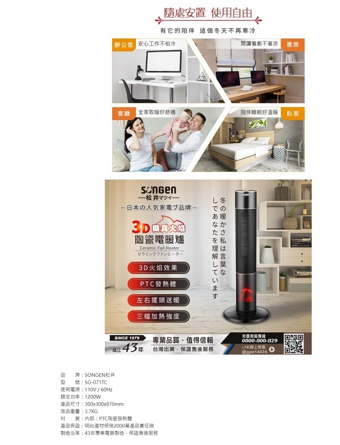 日本 SONGEN 松井 3D擬真火焰陶瓷立式電暖器/暖氣機/電暖爐 SG-071TC
