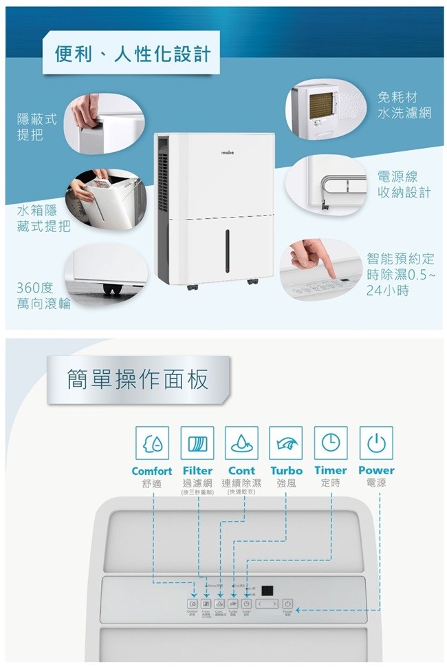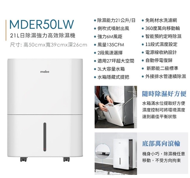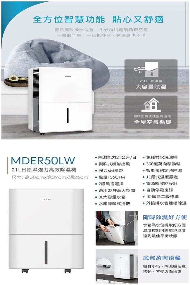 Mabe 美寶 21L側吹式強力高效除濕機(MDER50LW)