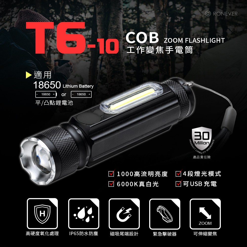[RONEVER] T6-6充電式工作燈手電筒 PA-T6-6