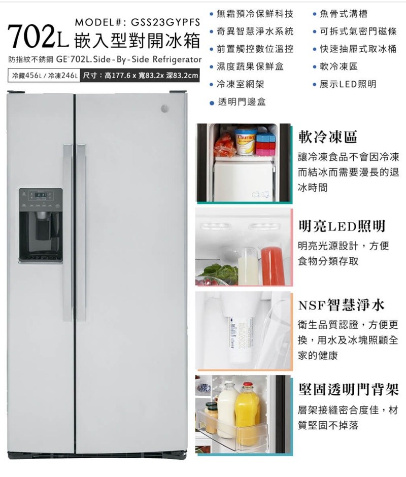 mabe美寶 GSS23GYPFS 不銹鋼防指紋 702L 嵌入型對開冰箱