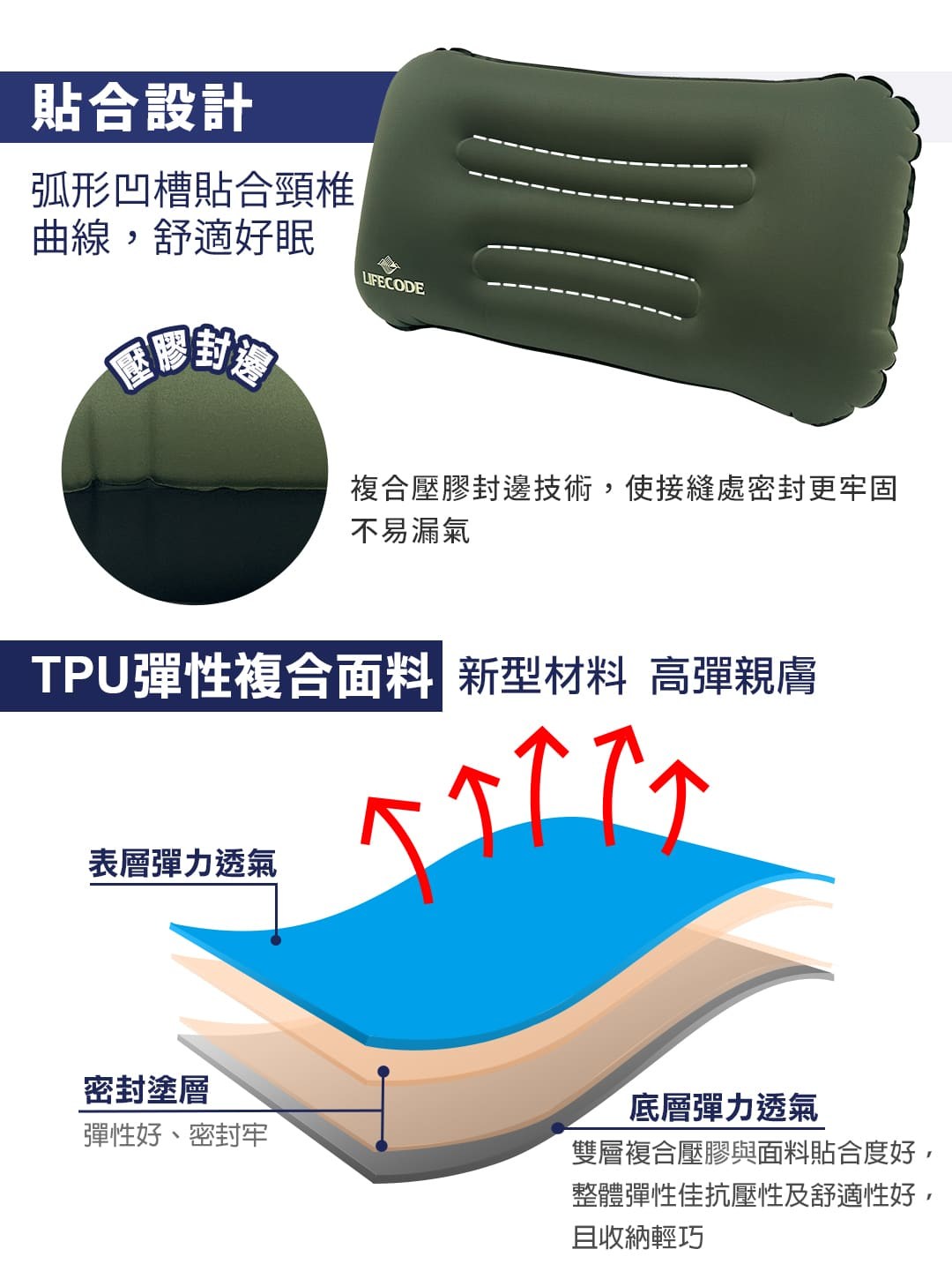 【LIFECODE】小二《人體工學》手壓充氣枕-軍綠/酷黑 15040124/8
