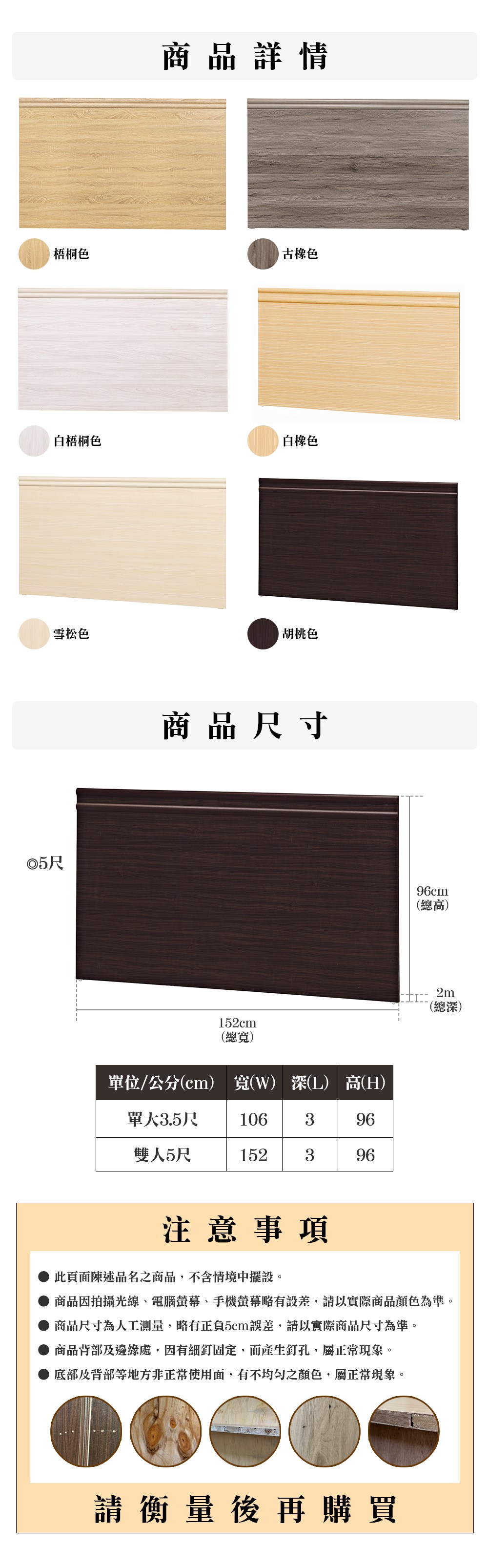 【多瓦娜】派克5尺床頭片(附插座)-三色白梧桐