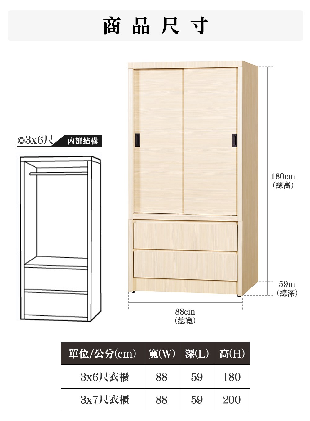 【顛覆設計】簡約3x6尺推門二抽衣櫃/衣櫥(無鏡子)白梧桐色