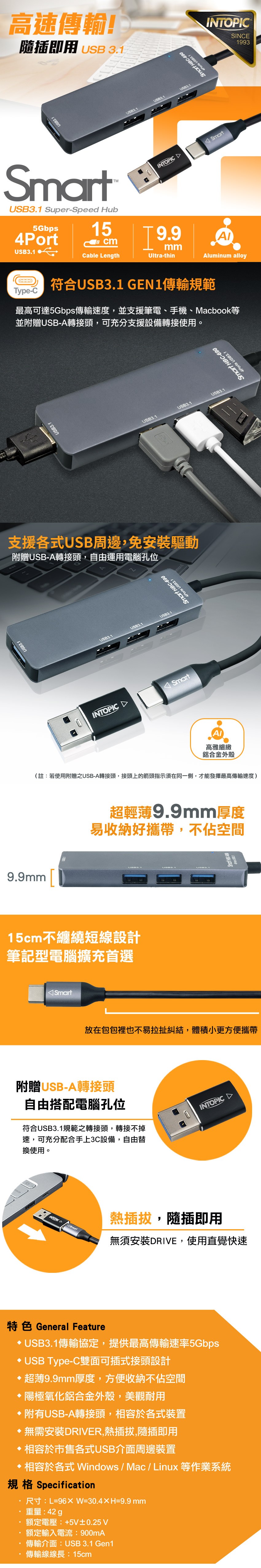 INTOPIC USB3.1 Type-C高速集線器HBC-690
