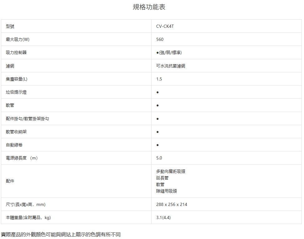 HITACHI 日立 電動吸塵器 CV-CK4T 560W超大吸力 奈米光觸媒濾片 抗菌除臭 三段吸力控制 可水洗吸頭 一鍵自動捲線 淺灰色