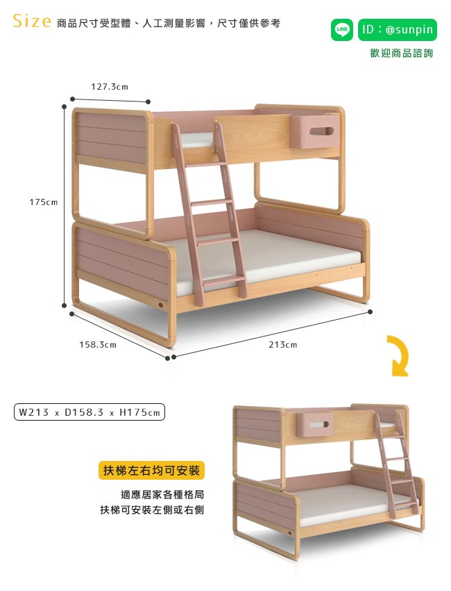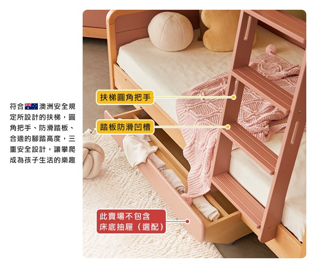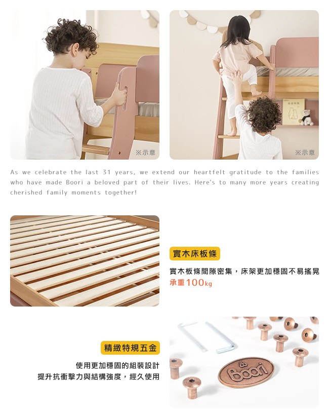 主材是山毛櫸,外觀平滑少木結,紋理均勻,結構堅硬沈重,因此承重好,適合作為床架。上下層床之間,有餘裕的高度可避免碰撞頭部,讓入睡起身更加安全。孩子睡姿多變、活潑好動,因此設計師加高上層床四周床板,讓小孩不用擔心翻身,安心入眠。床側板無銳角,圓角邊緣不刮手、好抓握。扶梯圓角把手、踏板防滑凹槽、合適的腳踏高度,三重安全設計,讓攀爬成為孩子生活的樂趣。實木床板條間隙密集,床架更加穩固不易搖晃,承重 100kg。精緻特規五金,使用更加穩固的組裝設計,提升抗衝擊力與結構強度,經久使用。
