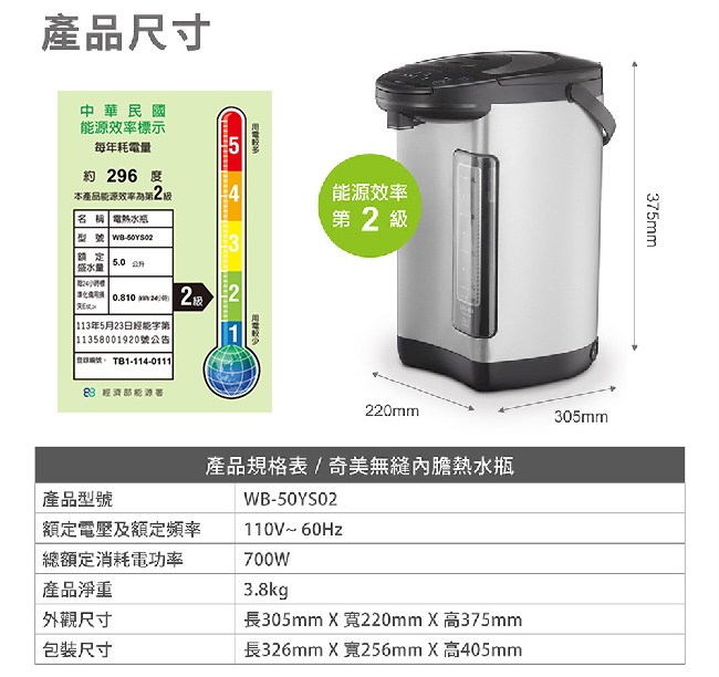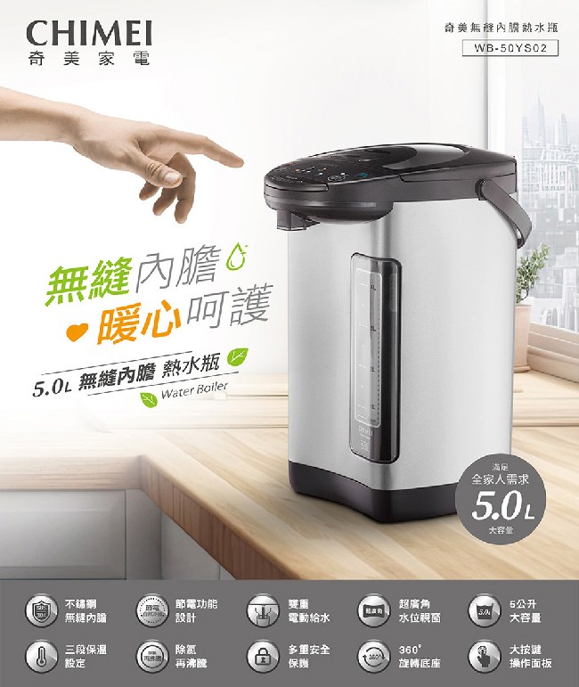 【CHIMEI奇美】5L不鏽鋼無縫內膽熱水瓶 WB-50YS02