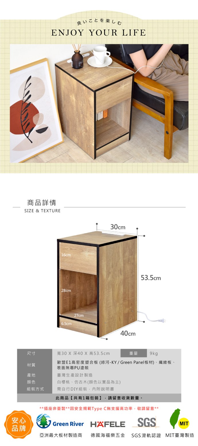 佳美 簡約仿舊床頭櫃收納矮櫃儲物櫃(附插座)