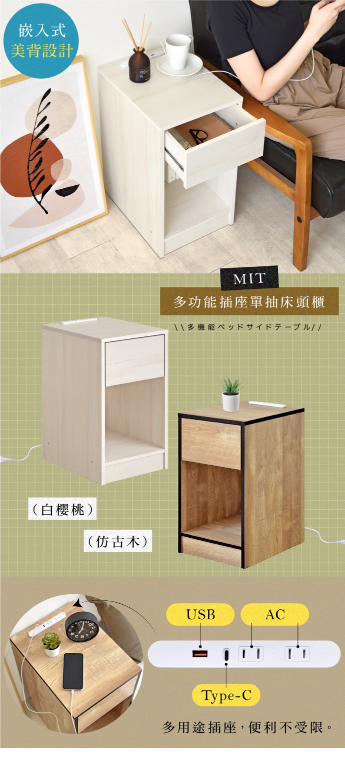 日系三抽屜床頭櫃(大款)(附插座) 4色【台灣製】