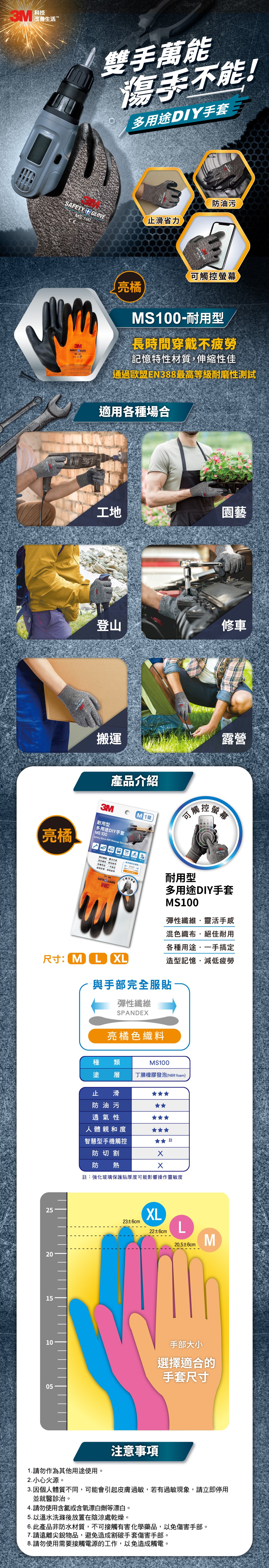 3M MS-100M 耐用型 多用途DIY手套-M 亮橘