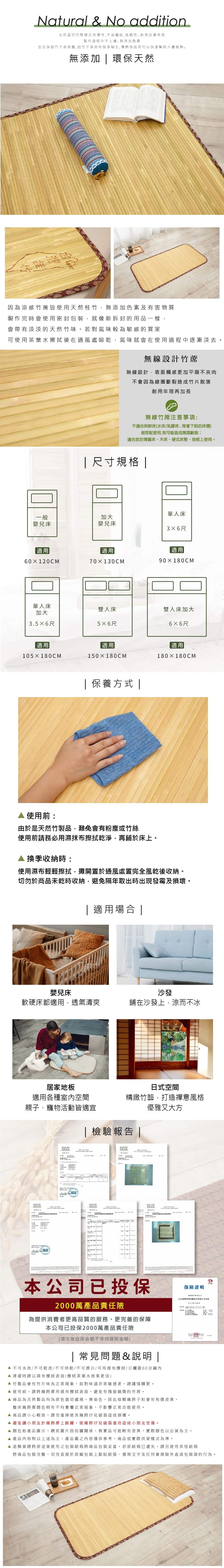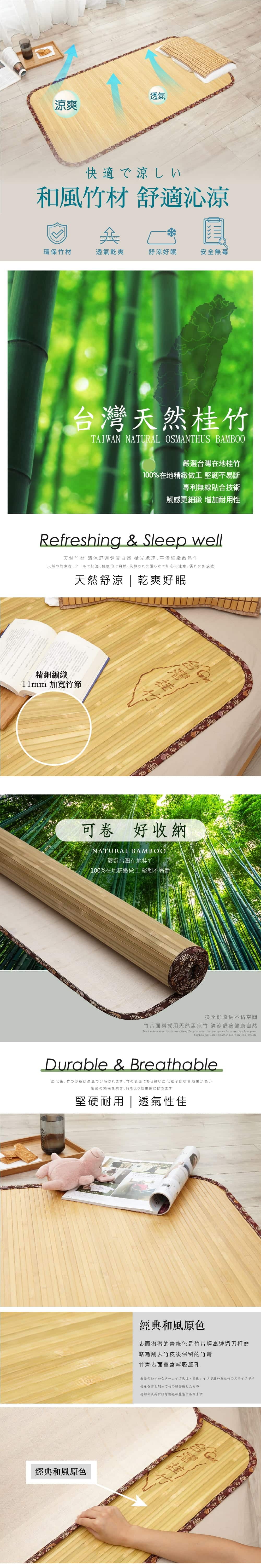 ※商品為天然製品均為原色裁切處理,無染色,因此每片竹片會有些微差異,整床竹蓆顏色稍有不均實屬正常現象,不影響正常功能使用。