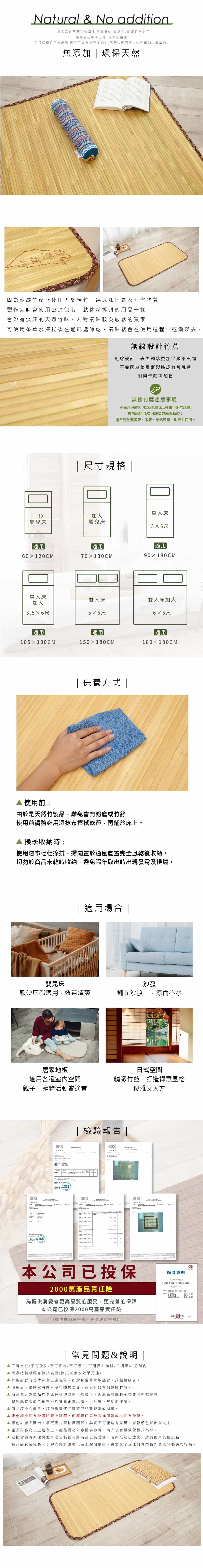 ※商品為天然製品均為原色裁切處理,無染色,因此每片竹片會有些微差異,整床竹蓆顏色稍有不均實屬正常現象,不影響正常功能使用。