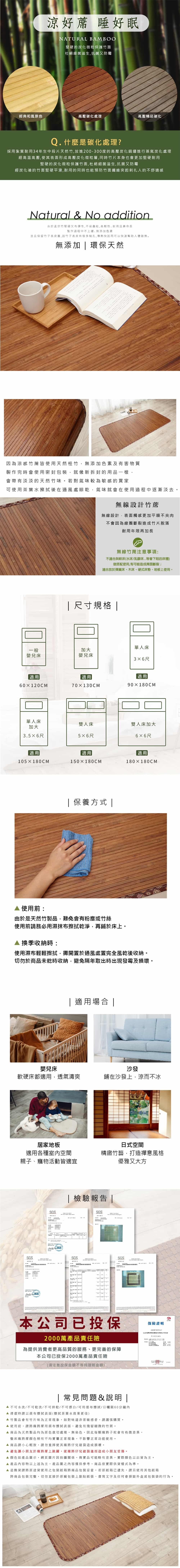 ※商品為天然製品均為原色裁切處理,無染色,因此每片竹片會有些微差異,整床竹蓆顏色稍有不均實屬正常現象,不影響正常功能使用。