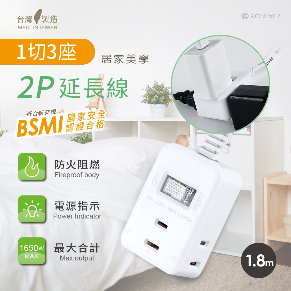RONEVER 1切2座延長線 2孔 PU-2122 0.9m 1條