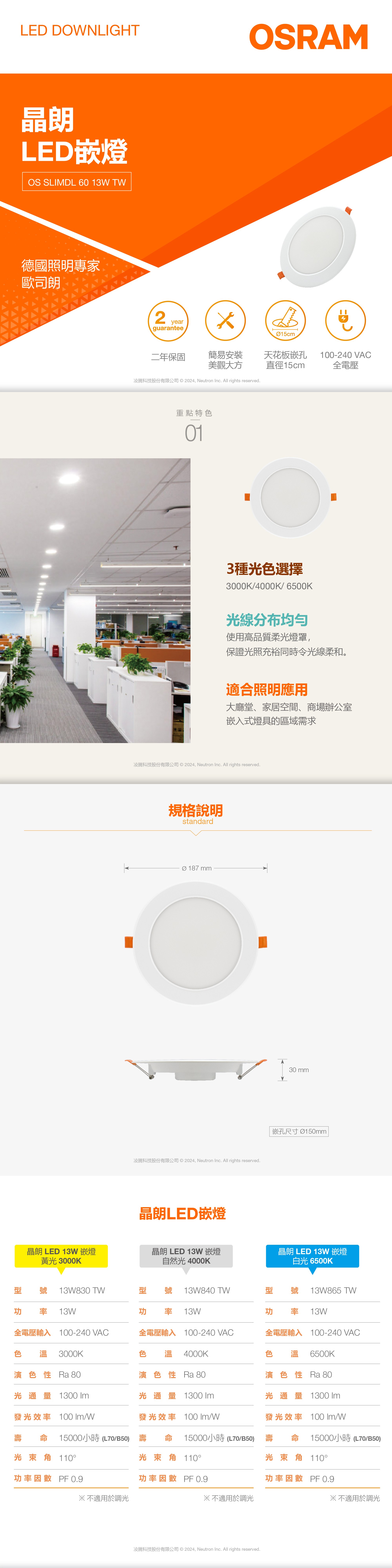 [凌騰科技]歐司朗OSRAM 晶朗LED 13W 15CM嵌燈 自然光 3入組