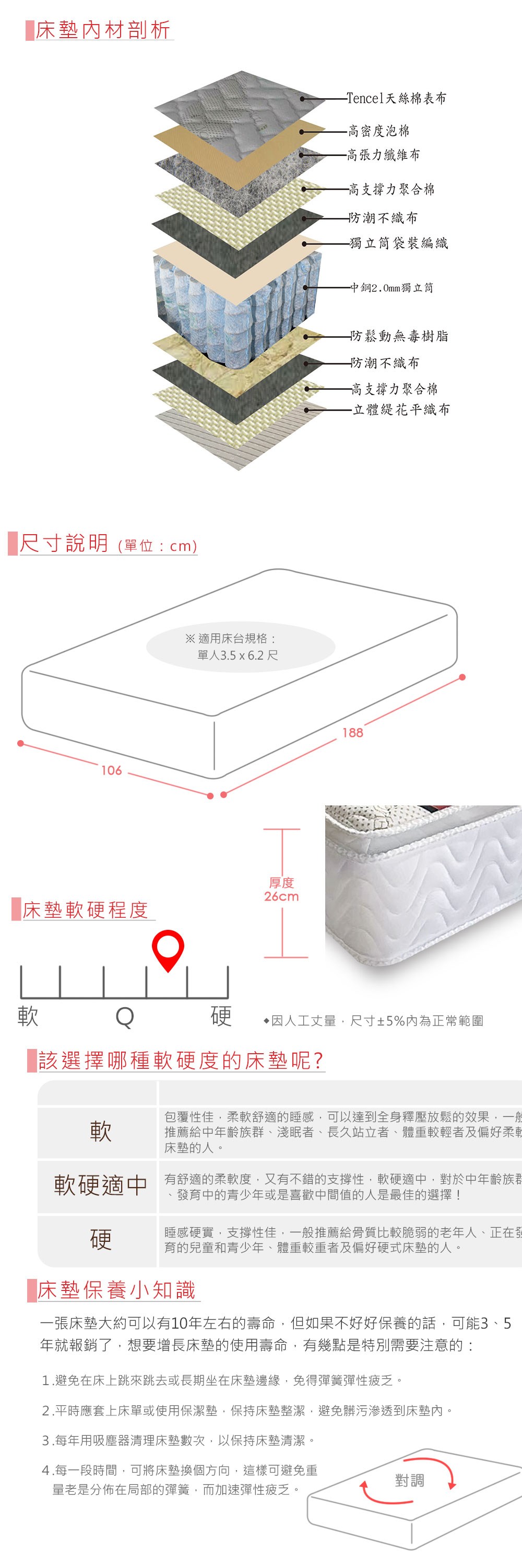 【顛覆設計】針織舒柔表布 三線 舒適健康彈簧床墊(單大3.5尺)