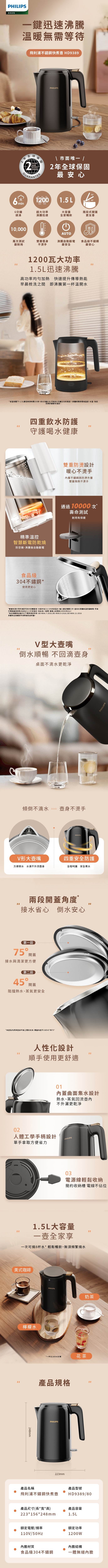 PHILIPS飛利浦 1.5L不鏽鋼防燙煮水壺 HD9389_廠商直送