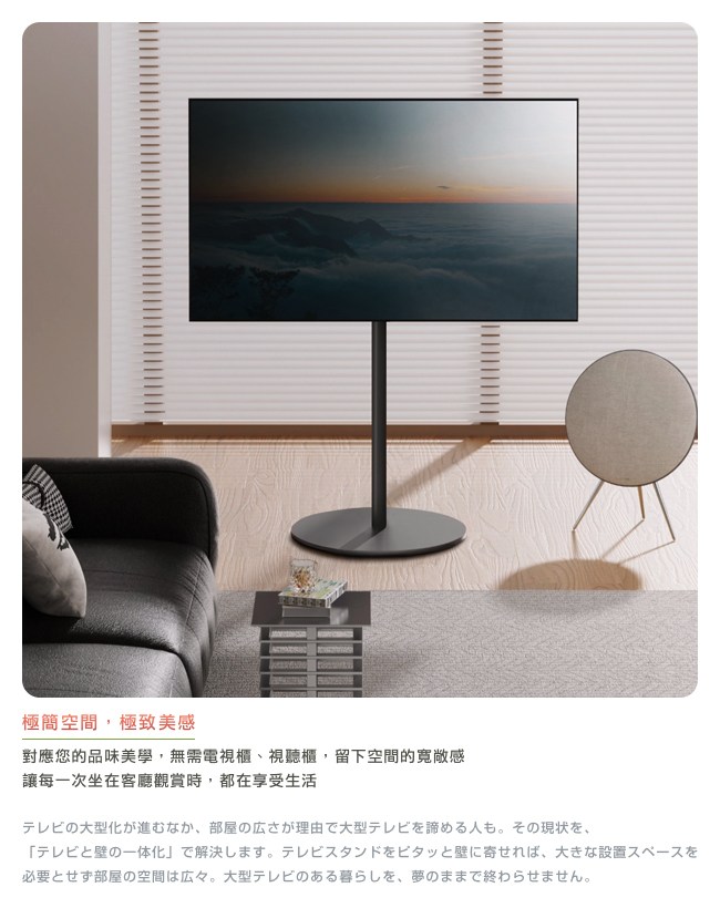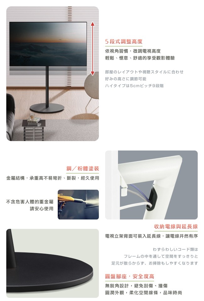 依個人視角習慣,可微調電視高度,擁有最舒適的觀影體驗。最高承重 15kg,並且日本試驗在震度 7 的情況下,相對於一般電視的擺放方式,更不易傾倒。因此可在任何場所佈置,如房間、客廳、廚房或商務空間。電視的線材,可裝入鋼管支架內,讓居家空間井然有序。MDF 圓底盤熱壓成型,密實封邊低翹曲,質感細膩,耐用性高。超低位腳輪,與常規輪子不同,除了半埋式設計外,此結構更能讓腳輪移動滑順平穩,不易受到灰塵阻礙。