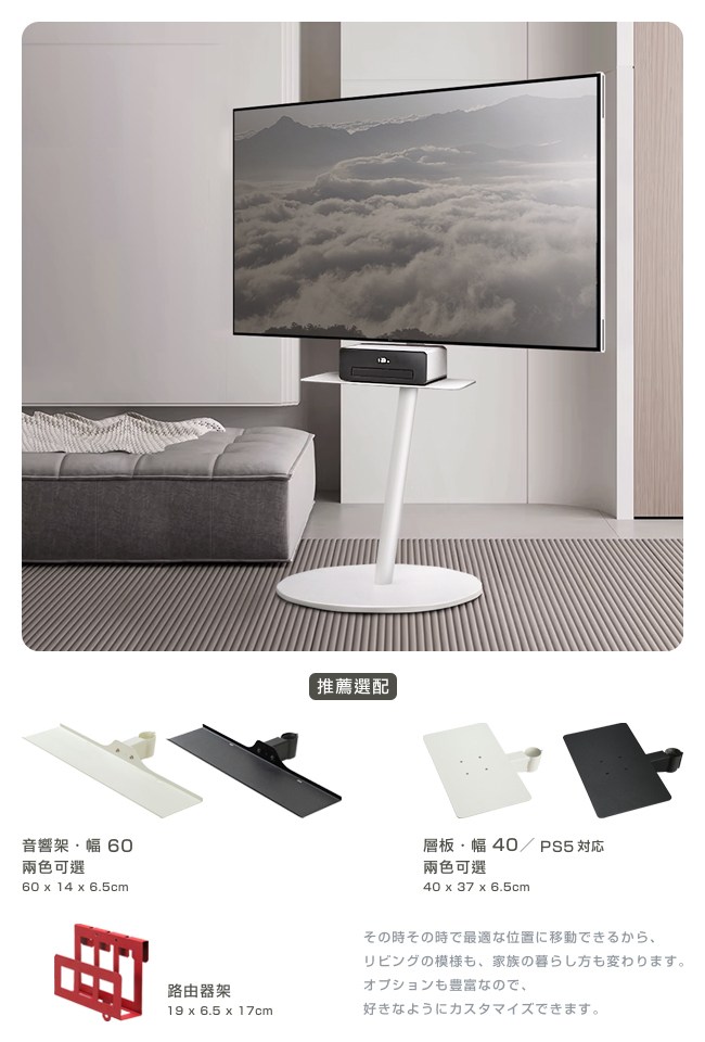 推薦選配音響架 60cm、層板 40cm,黑白 2 色可選。
