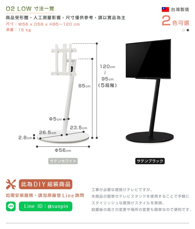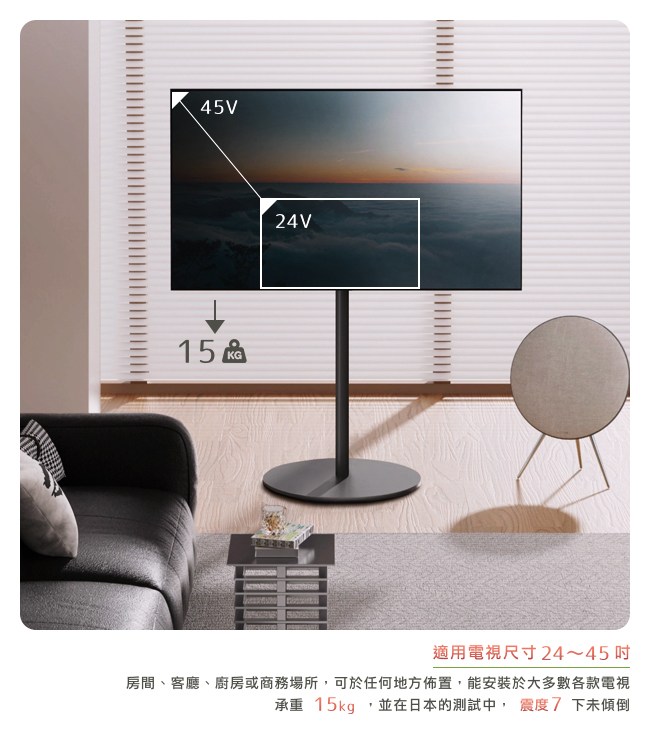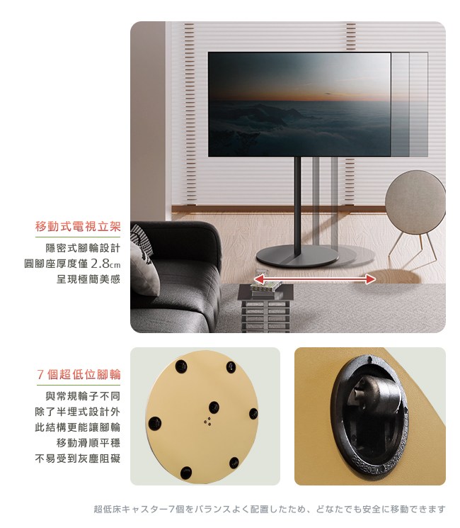 依個人視角習慣,可微調電視高度,擁有最舒適的觀影體驗。最高承重 15kg,並且日本試驗在震度 7 的情況下,相對於一般電視的擺放方式,更不易傾倒。因此可在任何場所佈置,如房間、客廳、廚房或商務空間。電視的線材,可裝入鋼管支架內,讓居家空間井然有序。MDF 圓底盤熱壓成型,密實封邊低翹曲,質感細膩,耐用性高。超低位腳輪,與常規輪子不同,除了半埋式設計外,此結構更能讓腳輪移動滑順平穩,不易受到灰塵阻礙。