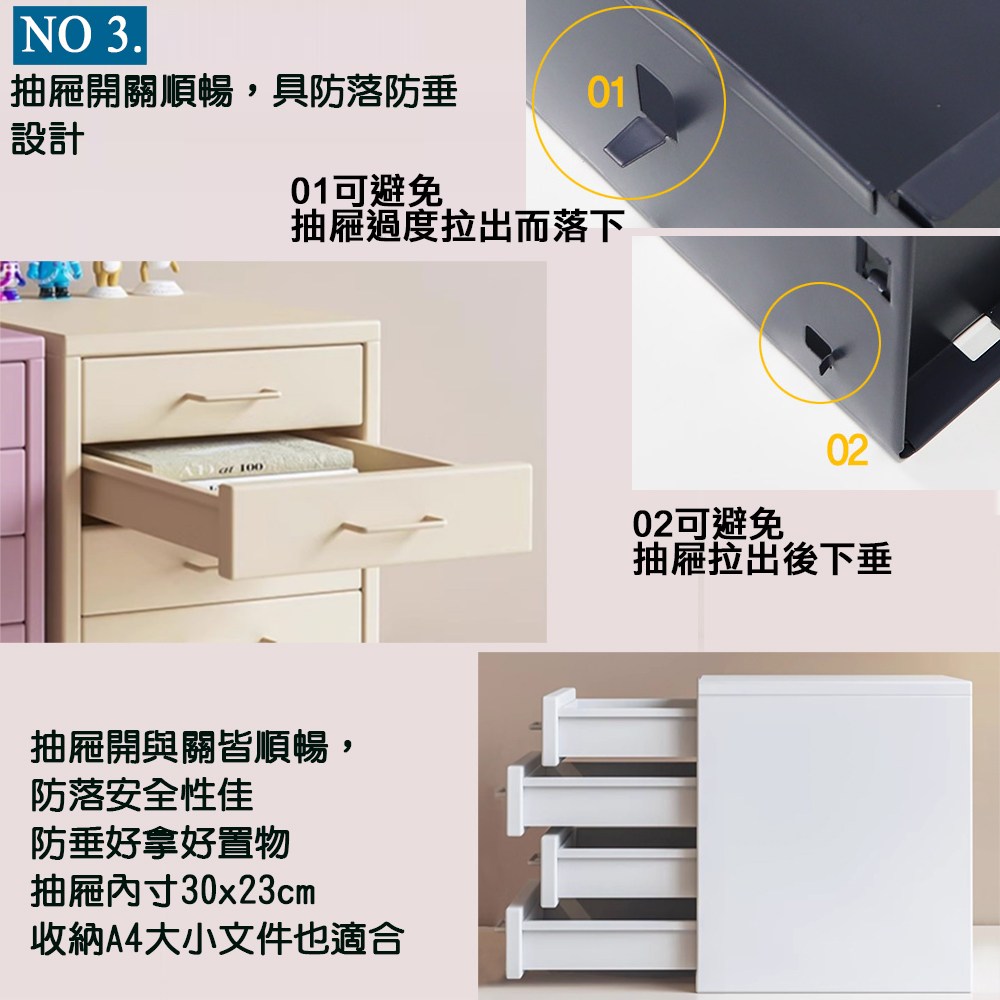 四小抽屜的設計,能容納A4尺寸的物品,桌上型使用的設計,可依需求放置於桌面上或櫥櫃上使用,讓原本被忽視的角落變為意想不到的儲存空間。每個抽屜皆防落防垂,拉出抽屜時不會因操作不慎而讓抽屜落下,也不會因拉出一半抽屜即下傾,不掉落不下垂,更加安全且貼心好用。