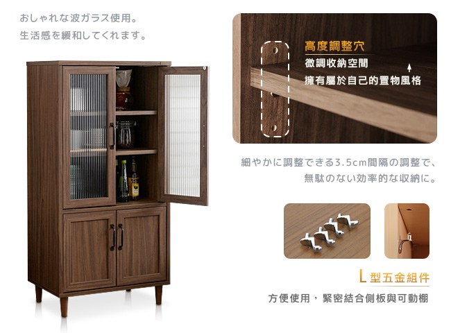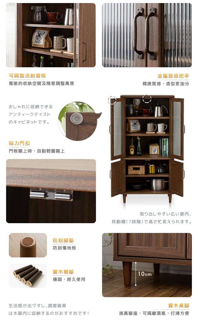 正統日本復古設計,四門的多樣置物空間,讓收納井然有序。可調式層板設計,可調整置物空間的大小,方便收納各式碗盤鍋具。磁力門扣,輕鬆自在的開關門板。實木圓腳,穩固櫃體、經久使用。挑高腳座設計,可隔離濕氣,方便清潔打掃。防刮腳墊,防刮傷地板。在細節處處用心,充分顯現當代設計簡約俐落但又極具設計美感魅力的精髓。