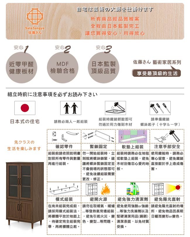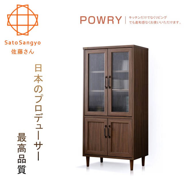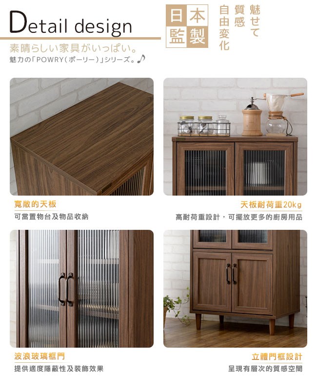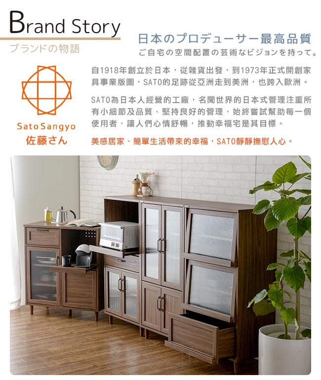 【Sato】日本品牌,職人精神的手工、講究獨特的細緻、質感上乘的細節、豐富變化品味極致,非凡大器。櫃面是高級木紋化妝紙面板、內部為蜂巢板材質,以精緻的設計和高品質的材質,打造出兼具品質與設計的雙重質感要求。加厚天板,耐荷重20kg,可擺放更多的廚房用品。波浪玻璃的門面,提供收納的隱蔽性與時尚感。透著光的波浪玻璃,展現與眾不同的細膩格調,與胡桃木色門相輝映,看見科技與人文間的完美融合,美觀質感、優雅而耐用。金屬復古把手,精緻的質感,時尚的氛圍。立體門框設計,呈現有層次的質感空間,讓居家氛圍更添優雅。