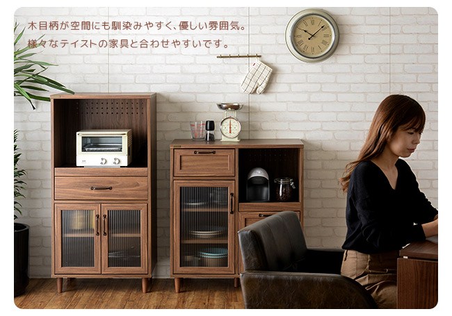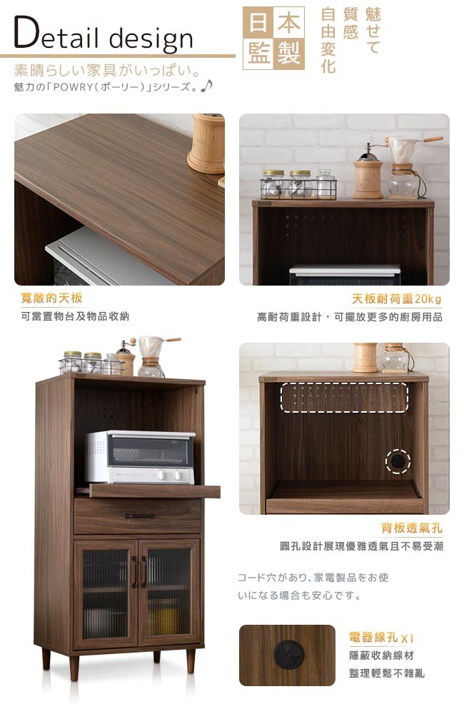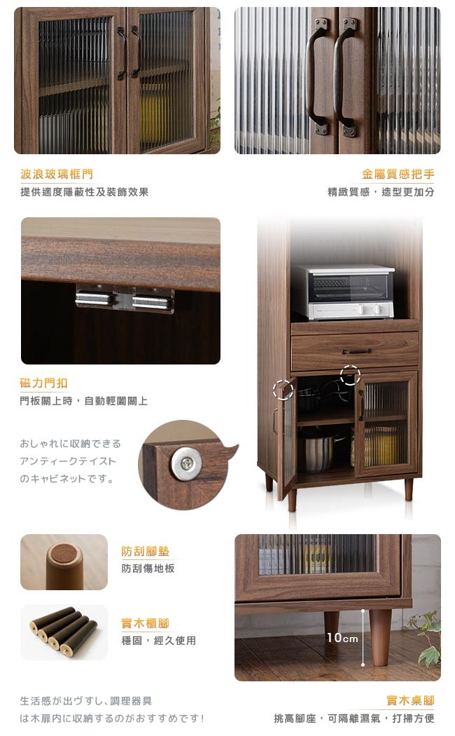 正統日本復古設計,一抽二門的多樣置物空間,讓收納井然有序。可調式層板設計,可調整置物空間的大小,方便收納各式碗盤鍋具。滾輪式滑軌,輕鬆流暢的開闔抽屜。磁力門扣,輕鬆自在的開關門板。實木圓腳,穩固櫃體、經久使用。挑高腳座設計,可隔離濕氣,方便清潔打掃。防刮腳墊,防刮傷地板。在細節處處用心,充分顯現當代設計簡約俐落但又極具設計美感魅力的精髓。