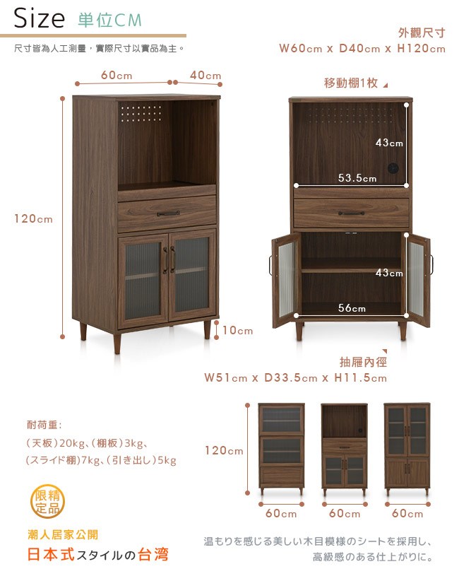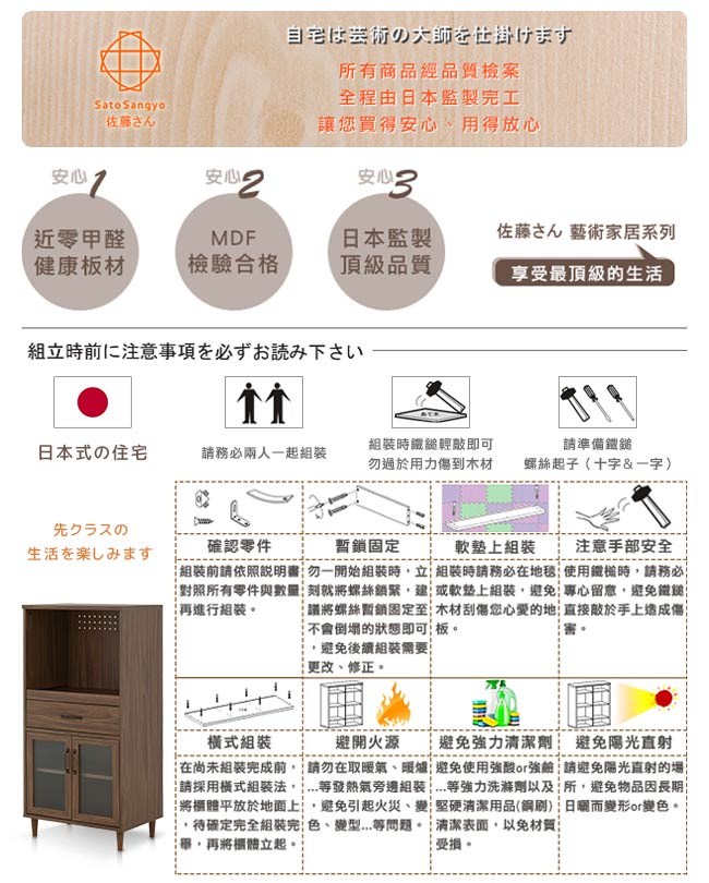 【Sato】日本品牌,職人精神的手工、講究獨特的細緻、質感上乘的細節、豐富變化品味極致,非凡大器。櫃面是高級木紋化妝紙面板、內部為蜂巢板材質,以精緻的設計和高品質的材質,打造出兼具品質與設計的雙重質感要求。加厚天板,耐荷重20kg,可擺放更多的廚房用品。開放滑動式檯面,擺放烹飪電器,使用與收納簡單方便。背板透氣孔設計,濕氣容易揮散,不易受潮。背板電器線孔,方便整理電線,廚房不紊亂。有效活用廚房的每一吋空間,讓使用烹飪電器來料理得心應手,不佔空間,使用便利,優雅自如的氛圍油然而生。