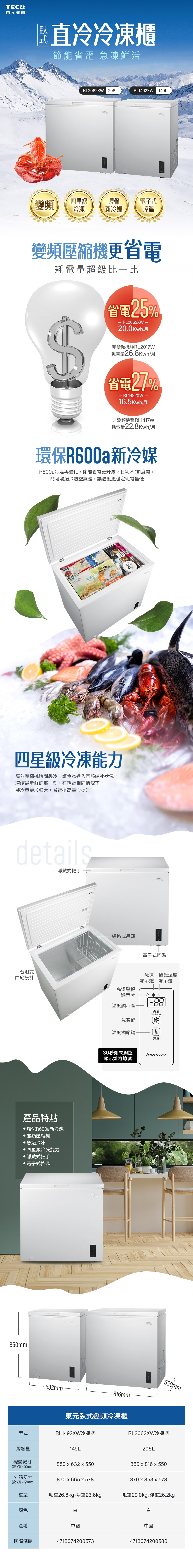TECO東元149L變頻臥式冷凍櫃 RL1492XW~含拆箱定位+舊機回收