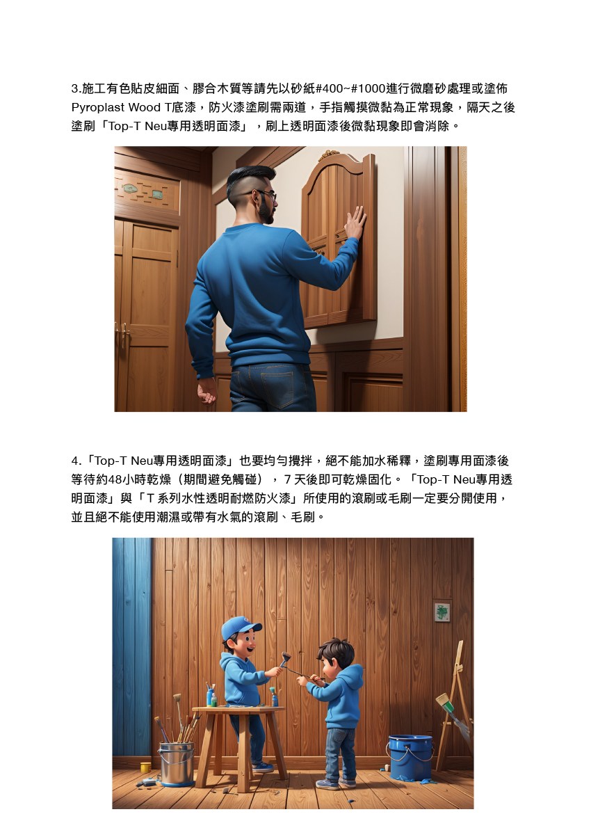 4. 防火漆層塗刷24小時後,即可塗刷TOP-T專用透明面漆,塗刷專用面漆時,請先徹底攪拌,毛刷必須與防火漆分開使用, 請勿加水溶劑,塗刷後約48小時待乾燥,期間請避免觸碰。