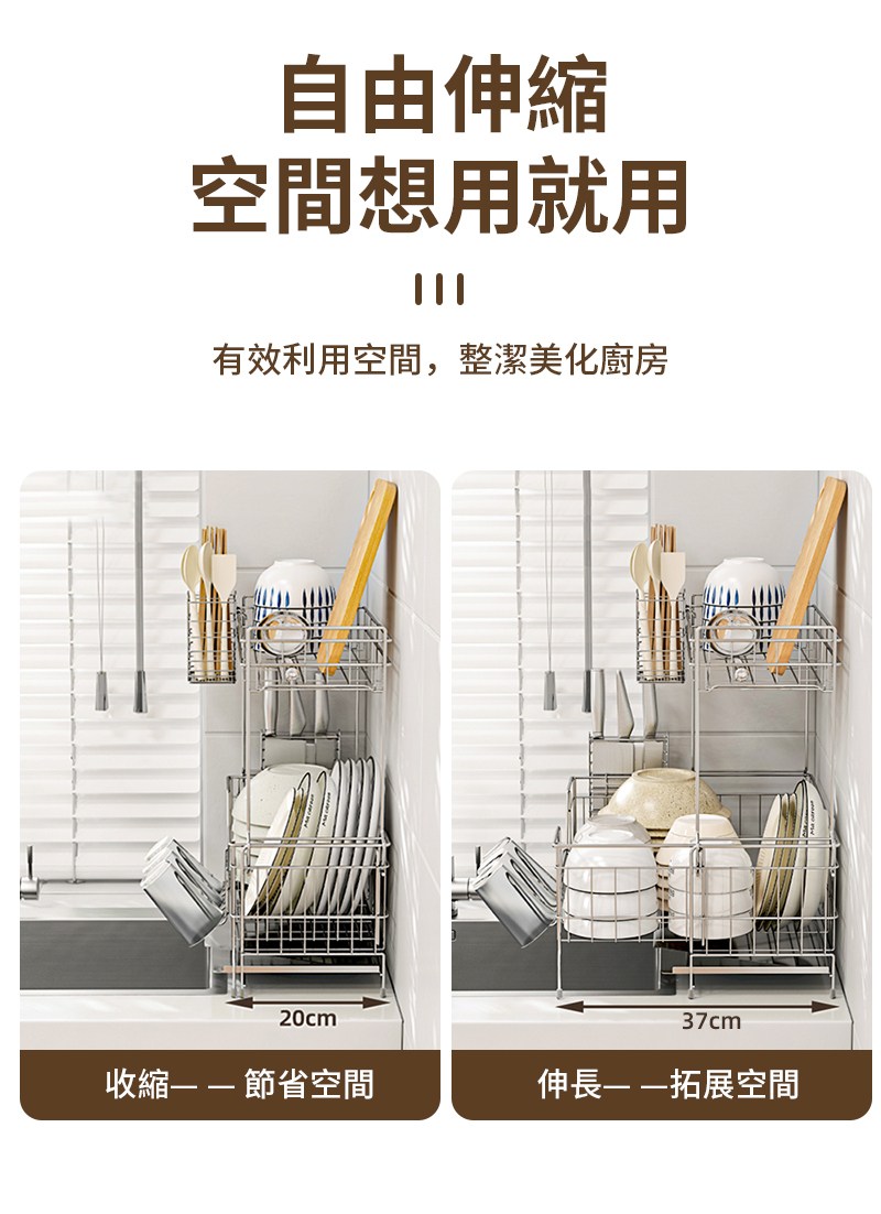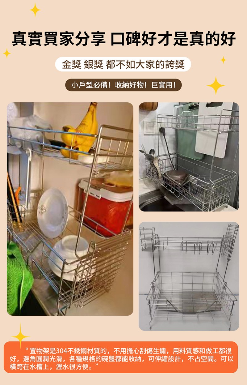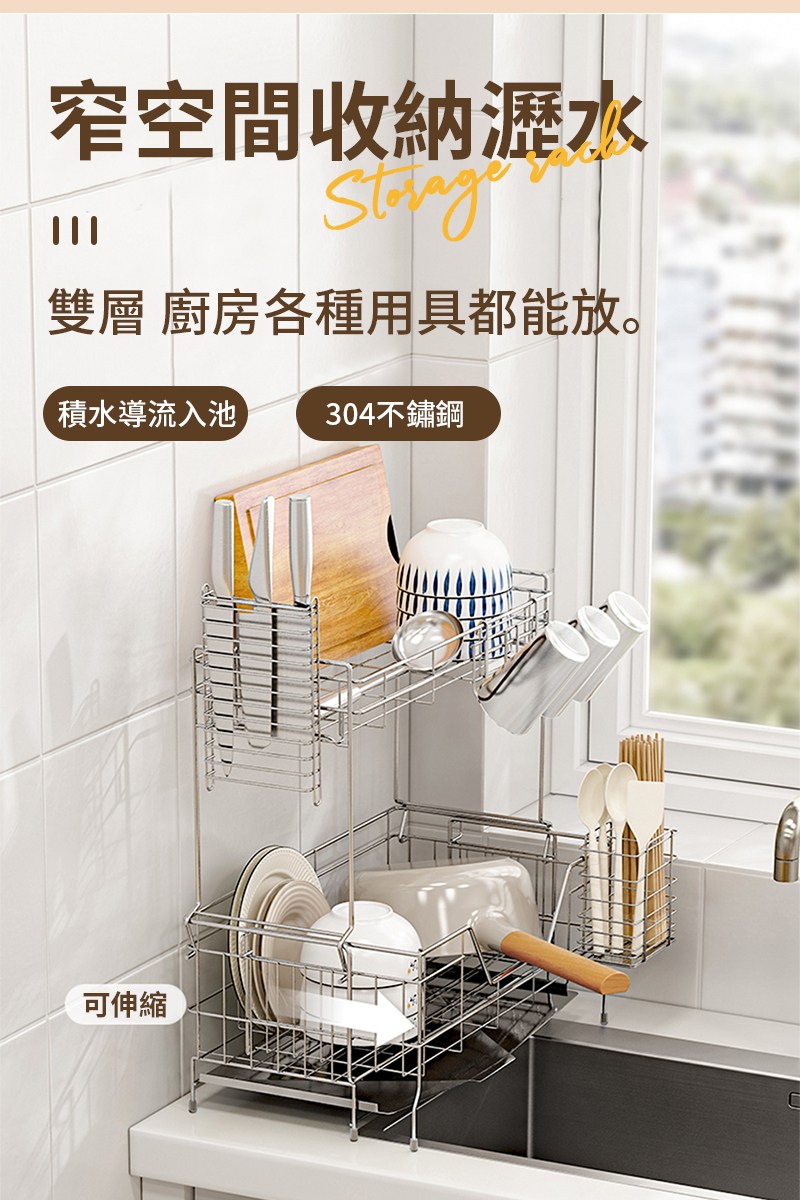 【慢慢家居】304不鏽鋼-可伸縮廚房水槽雙層瀝水架 (碗盤瀝水架 水槽收納架)304瀝水籃(雙層)