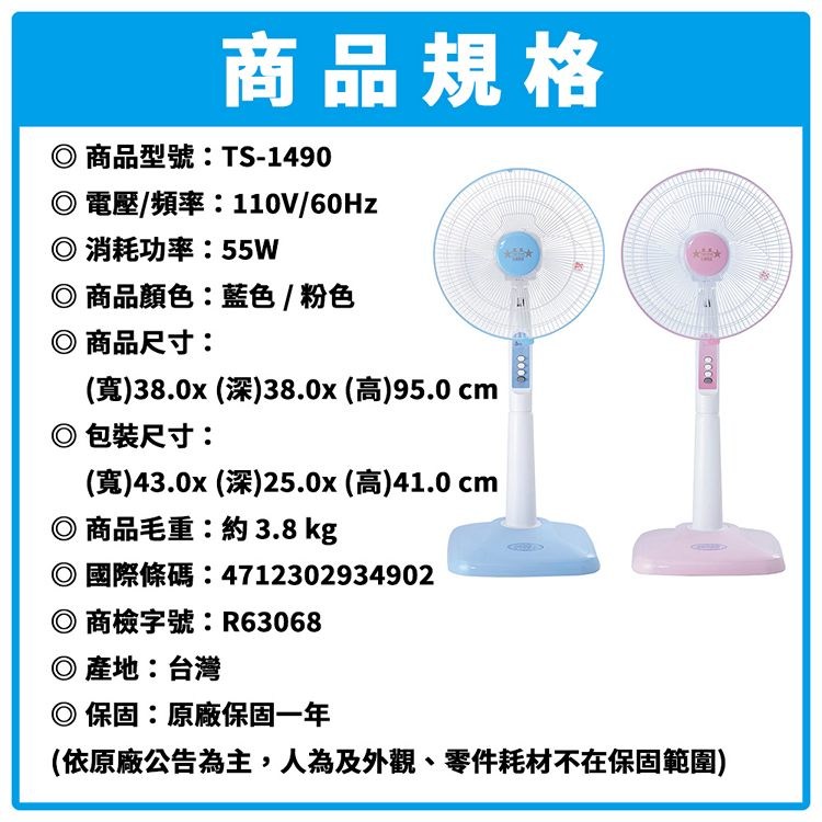 雙星牌 14吋機械式立扇 TS-1490 ~顏色隨機出貨