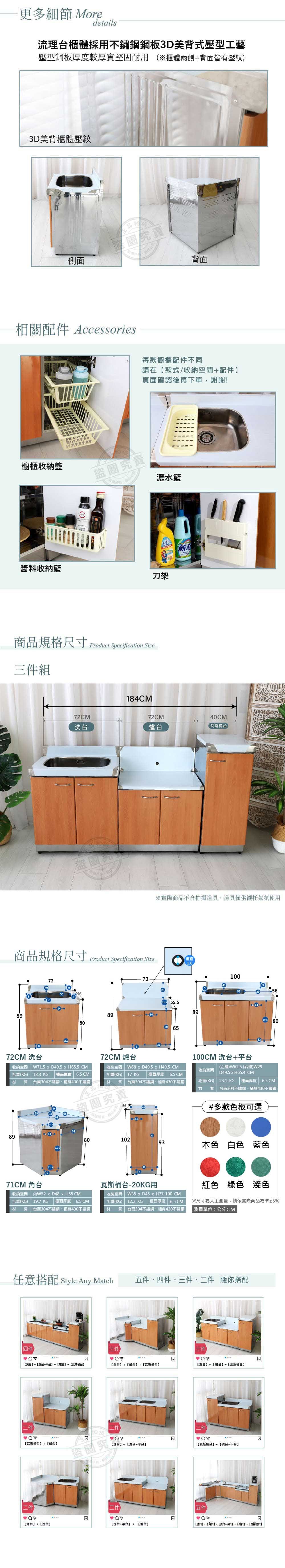 【Abis】客製商品-頂級升級款不鏽鋼三件組系統櫥櫃-72洗台+72爐台+桶台/流理台-多款門板可選(桶身430)藍色