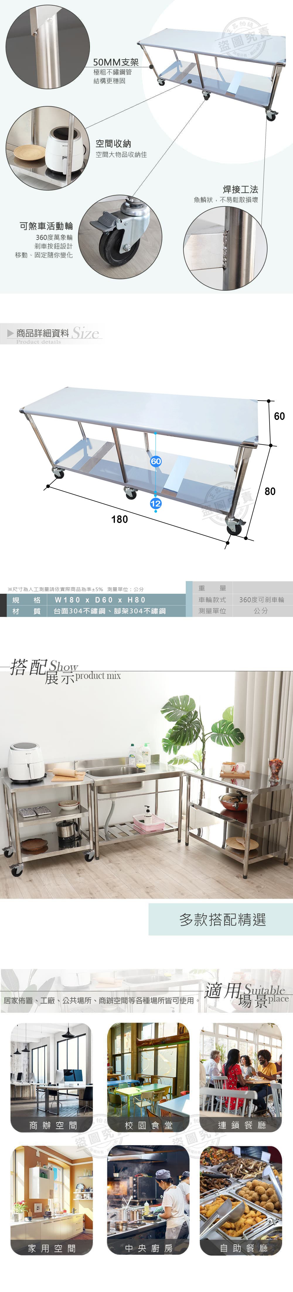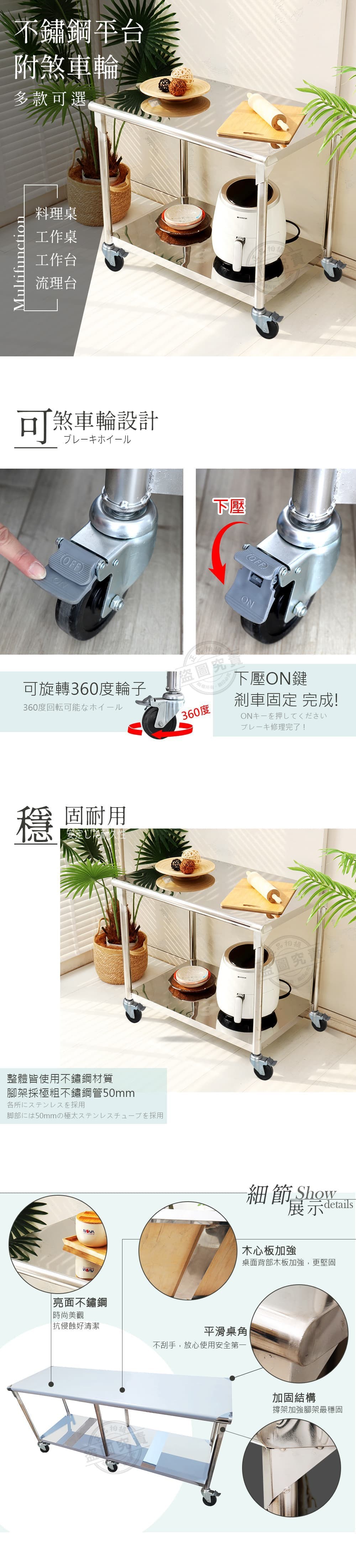 【Abis】客製商品-豪華升級版60X180CM二層圓角304不鏽鋼桌-附煞車輪/料理桌/工作台/流理台(2尺x6尺)
