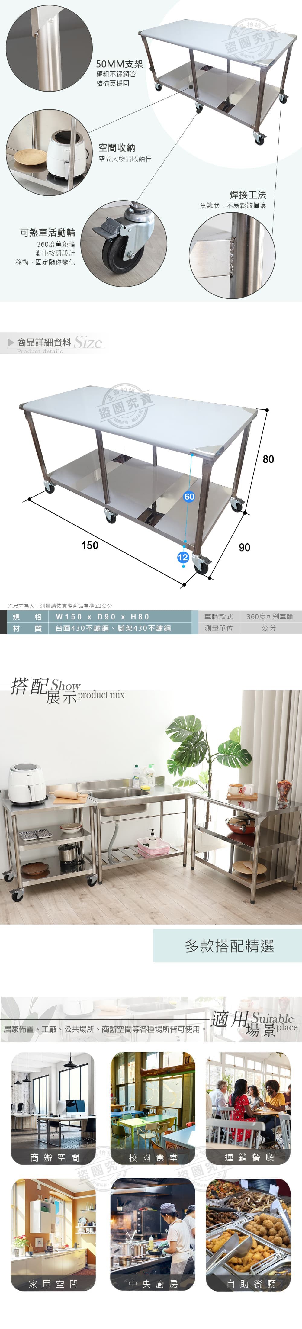 【Abis】客製商品-豪華升級版90X150CM二層圓角304不鏽鋼桌-附煞車輪/料理桌/工作台/流理台(3尺X5尺)