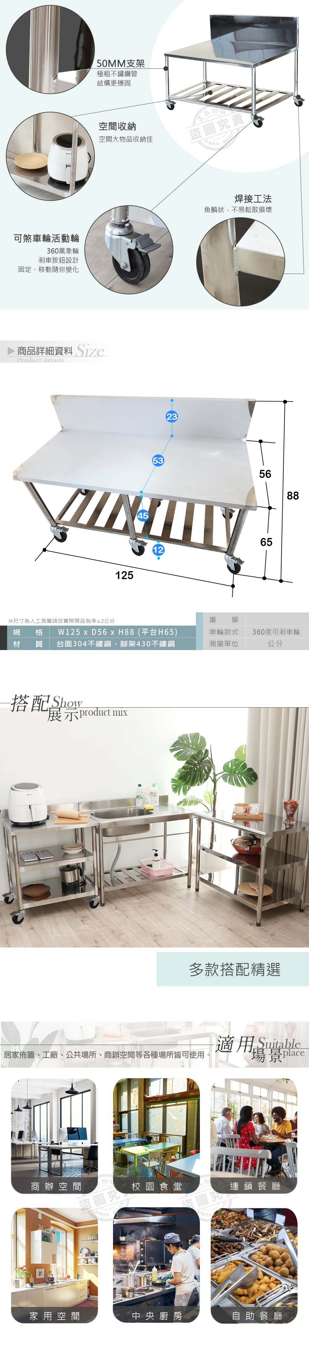 【Abis】客製商品-豪華升級版加牆款二層304不鏽鋼桌-附煞車輪/料理桌/工作桌/工作台/流理台(125X56CM)