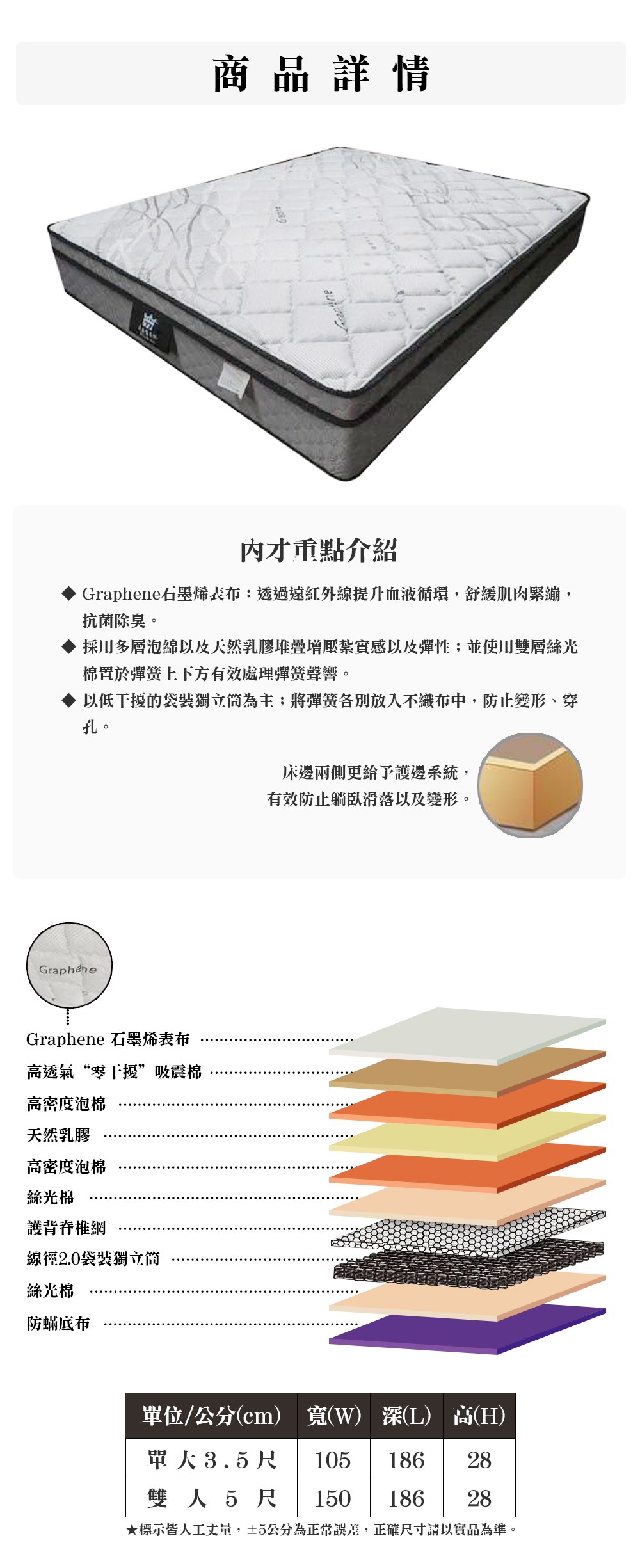 【顛覆設計】石墨烯表布 乳膠 護邊 舒適健康獨立筒床墊(單大3.5尺)