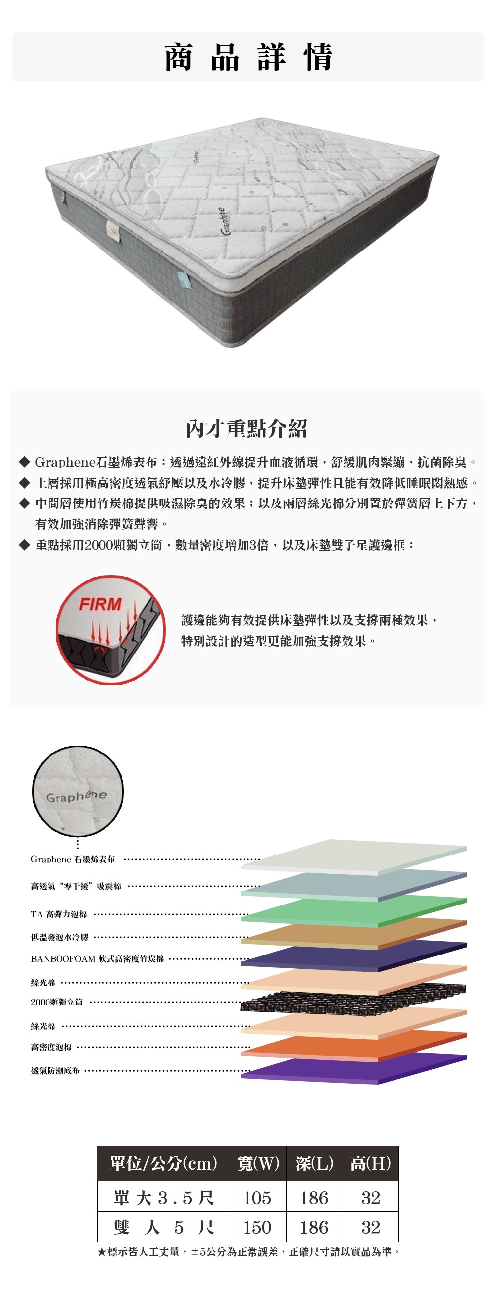 【顛覆設計】石墨烯表布 護邊 舒適健康獨立筒床墊(單大3.5尺)
